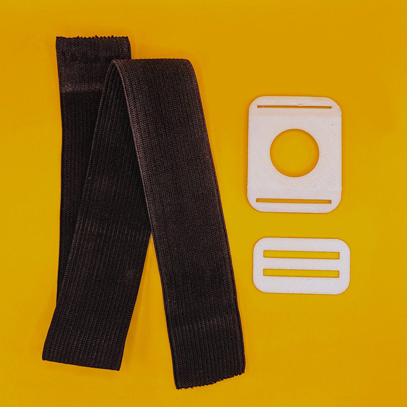 Het elastiek is gemaakt van Nylon en zowel de gesp als de sensor houder zijn gemaakt van PetG met een 3D-printer.